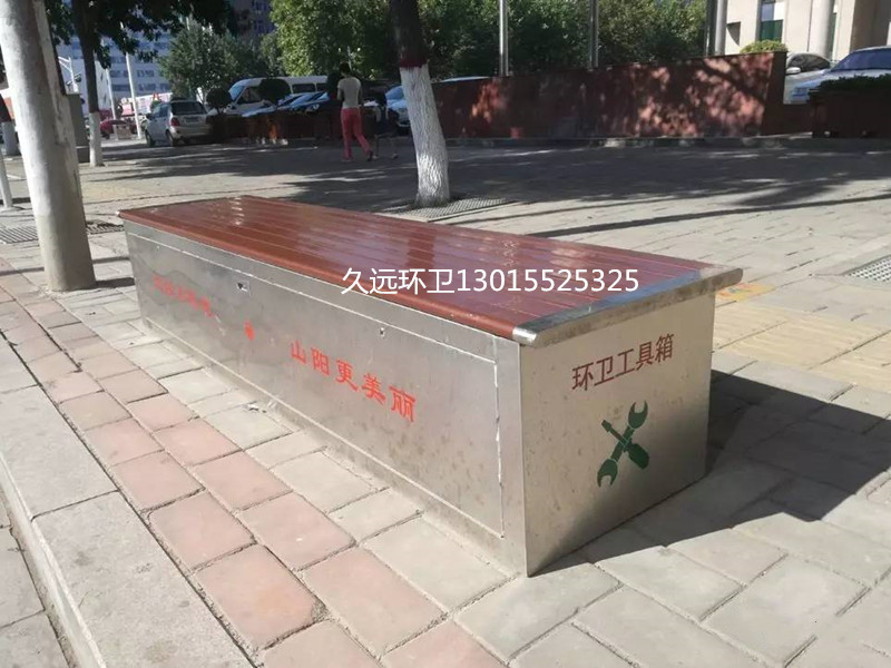 保潔員工具箱座椅是一種新型市政街道存放保潔員和環(huán)衛(wèi)工人工具、用具的多功能箱子,它既是工具箱,也是座椅??梢越o保潔員提供一個(gè)日常休息和放置工具的儲(chǔ)物箱,也可以給路人提供一個(gè)臨時(shí)、短期休息的坐凳。對(duì)保潔員的日常保潔工具的存放和日常用品起到了規(guī)范管理作用,美化城市環(huán)境,提升城市文明。
